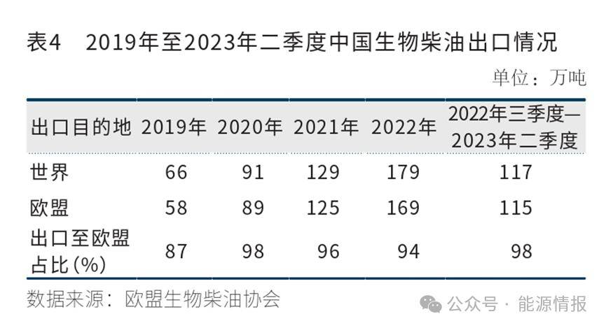 按照欧盟生物柴油协会的,2023年12月20日,欧盟委员会起头对中国向欧洲出口的生物柴油倡议反推销查询拜访,此项查询拜访将于不跨越14个月内完成,并可能正在倡议后7个月内采纳姑且反推销办法。2022年三季度至2023年二季度,欧盟生物柴油一般平均价钱为2500~3000欧元/吨;中国出口到欧洲的生物柴油到岸价钱(CIF)为1300~1415美元/吨,欧洲生物柴油协会认定中国推销幅度为98%~117%。连系欧盟内部生物柴油企业产销量及产能操纵率降低和中国出口量大幅添加的环境(见表3和表4),估计欧盟对中国出口至欧洲的生物柴油征收反推销税的可能性很大。